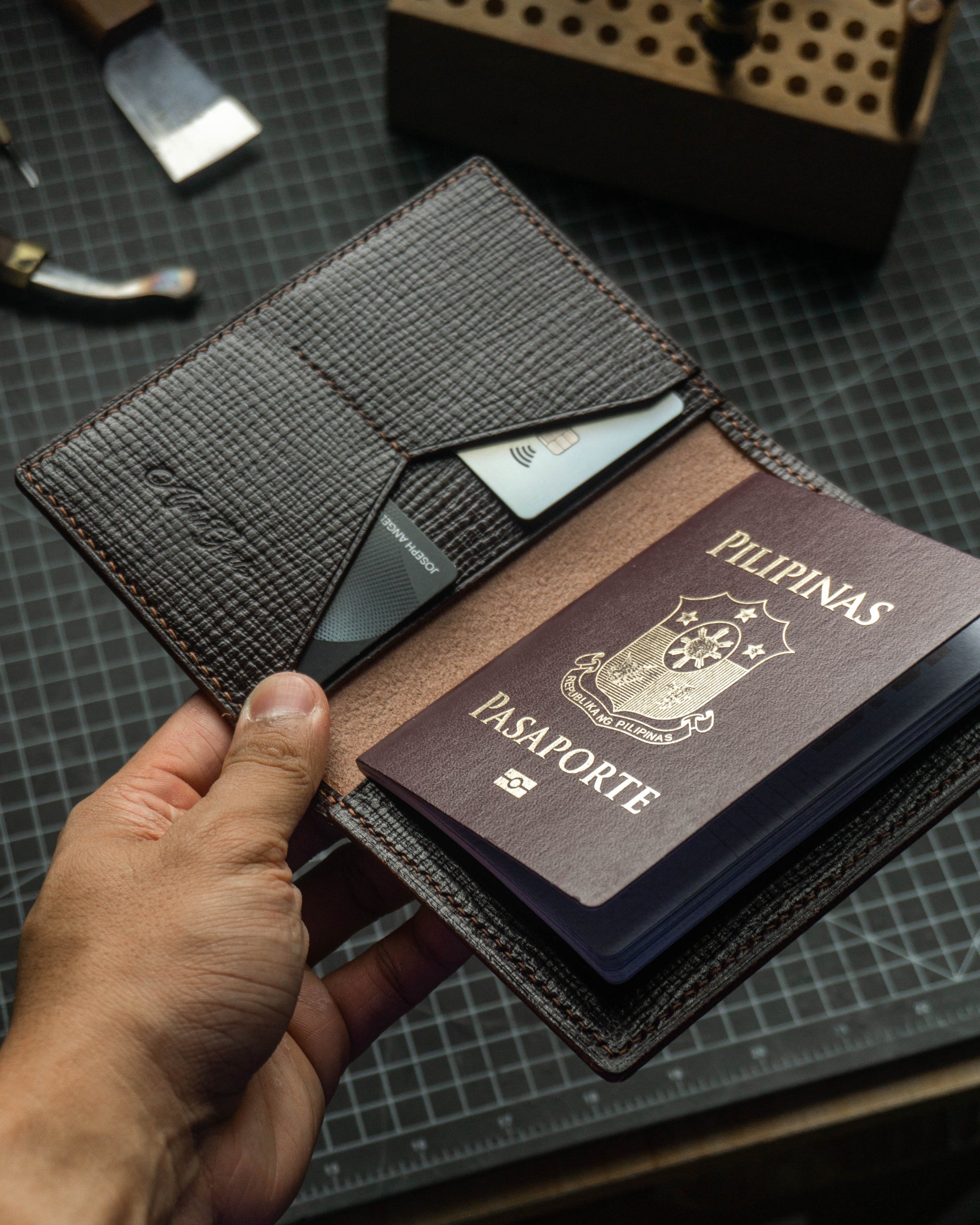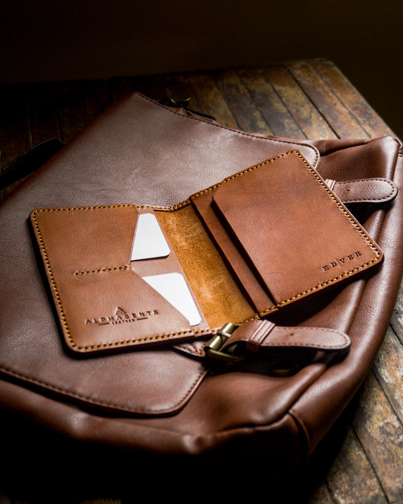 The Traveler passport wallet is ready to hit the road whenever you are. Made from beautiful vegetable tanned leather and high quality waxed linen thread, it features 2 card slots for your most important cards and 2 large pockets that hold your notebook, passport, boarding pass, cash and anything else you need to keep in one place when you are out on an adventure.