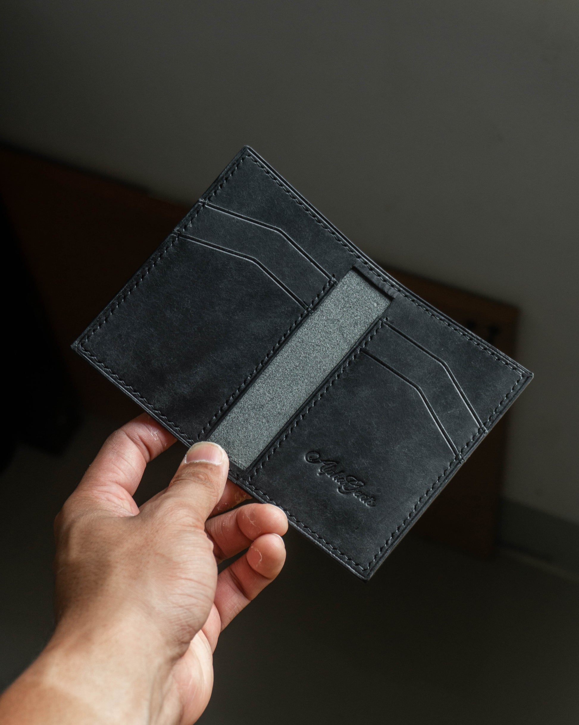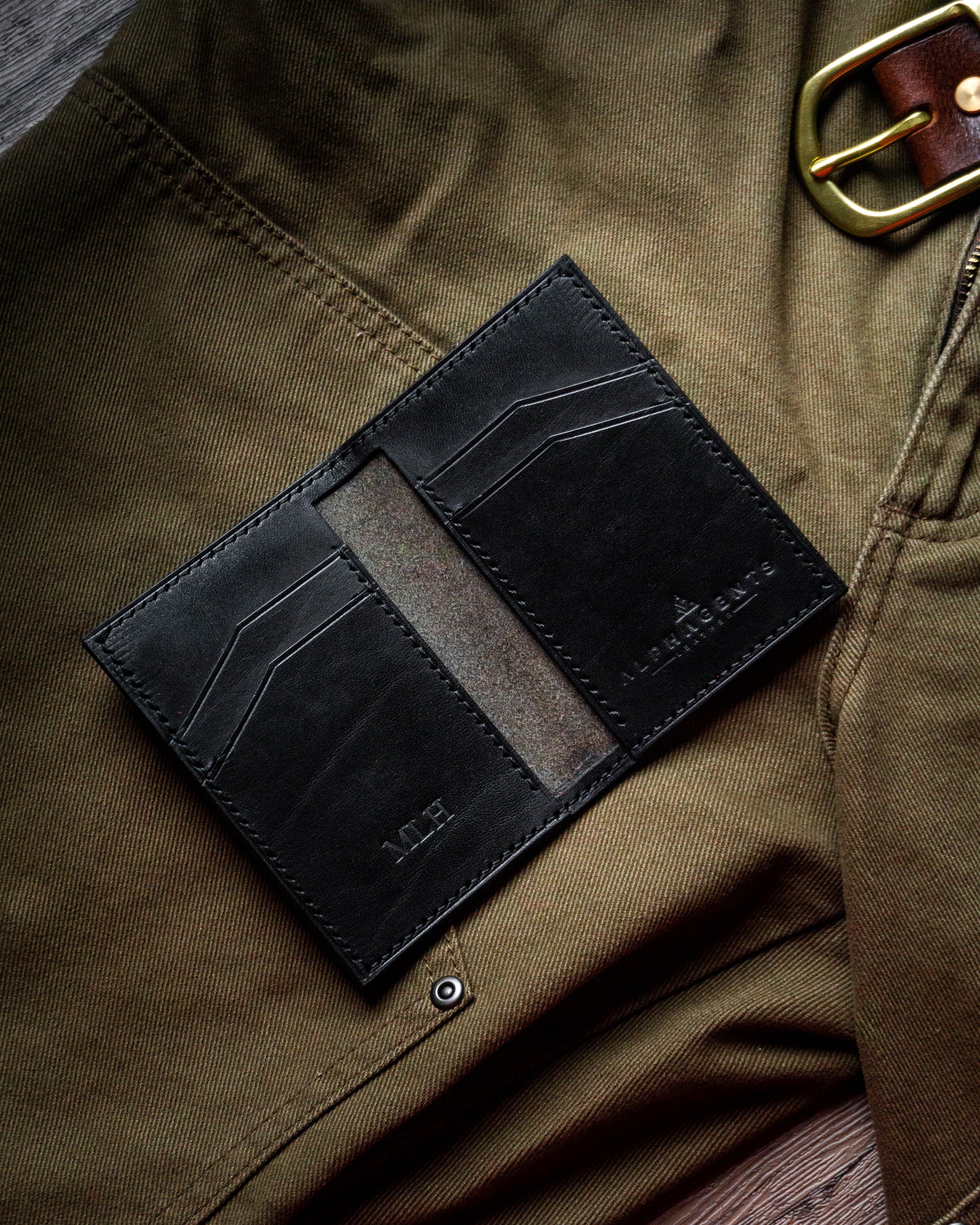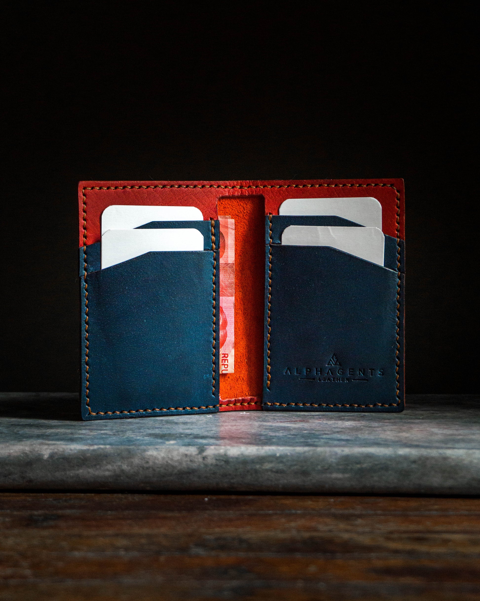 A simple clean cut vertical style bifold wallet that is completely unique to any other wallet in the world. This is consistently our most popular wallet in our line. 4 card slots and 2 inner pockets. Hand burnished edges and branded with our signature makers mark.