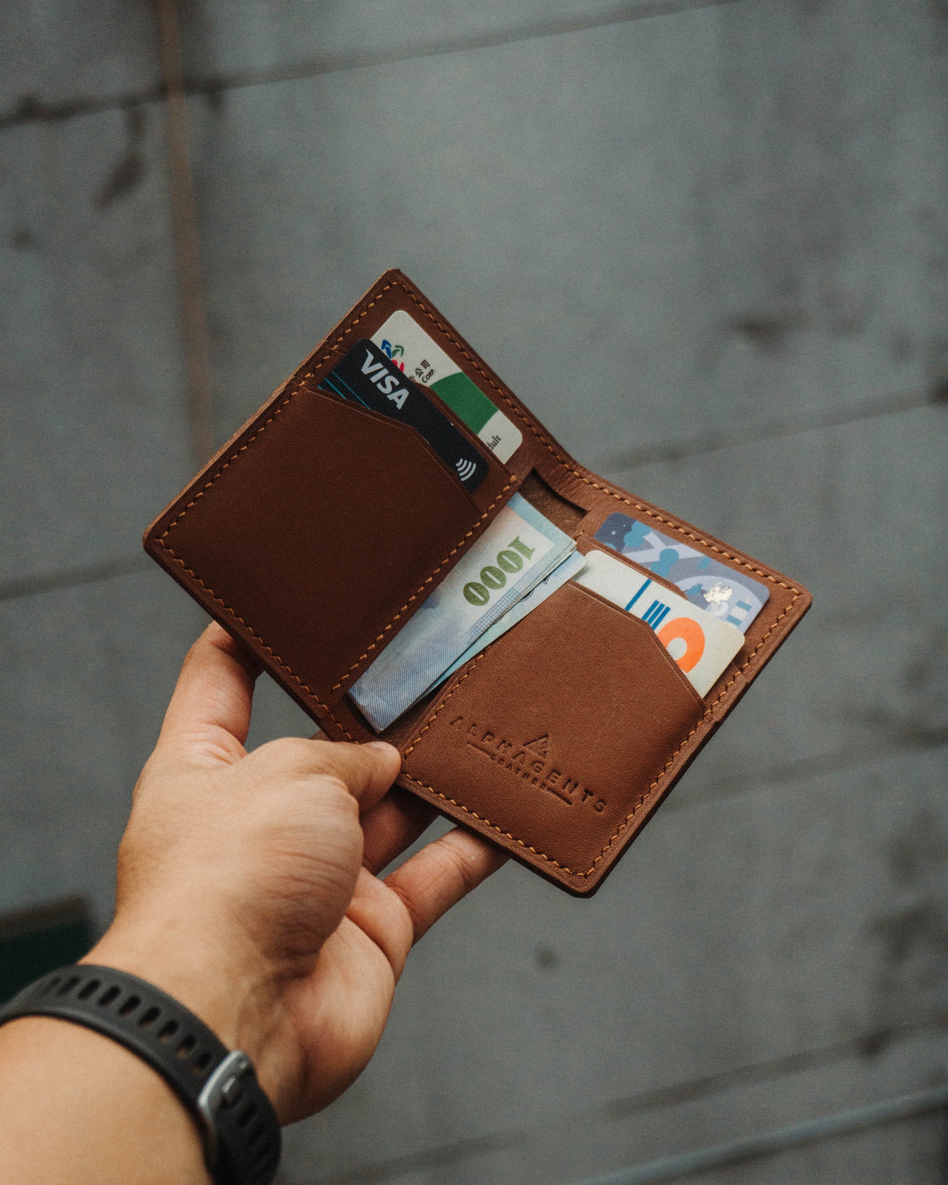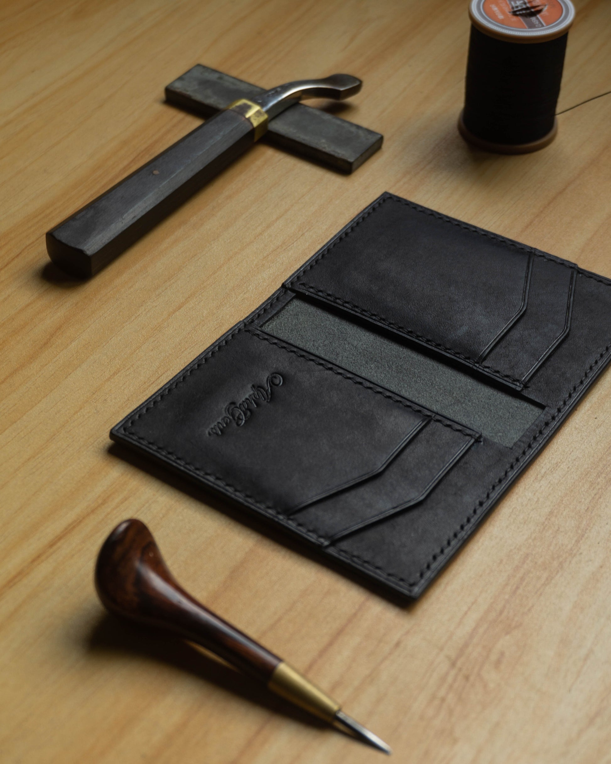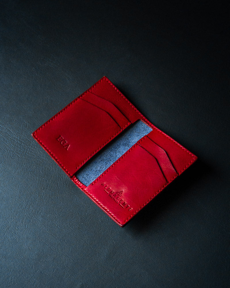 A simple clean cut vertical style bifold wallet that is completely unique to any other wallet in the world. This is consistently our most popular wallet in our line. 4 card slots and 2 inner pockets. Hand burnished edges and branded with our signature makers mark.